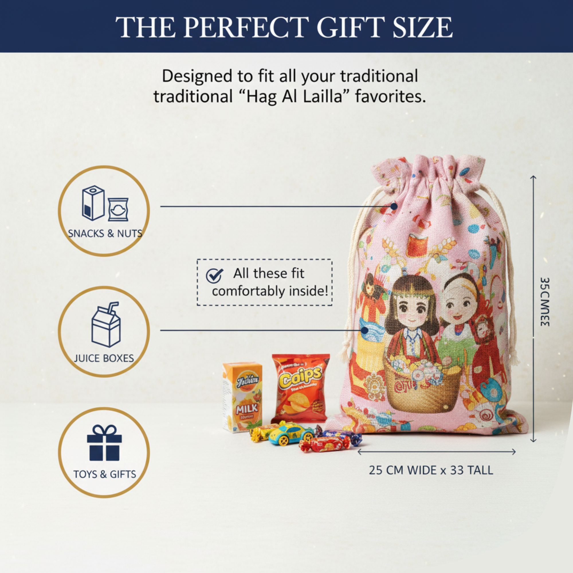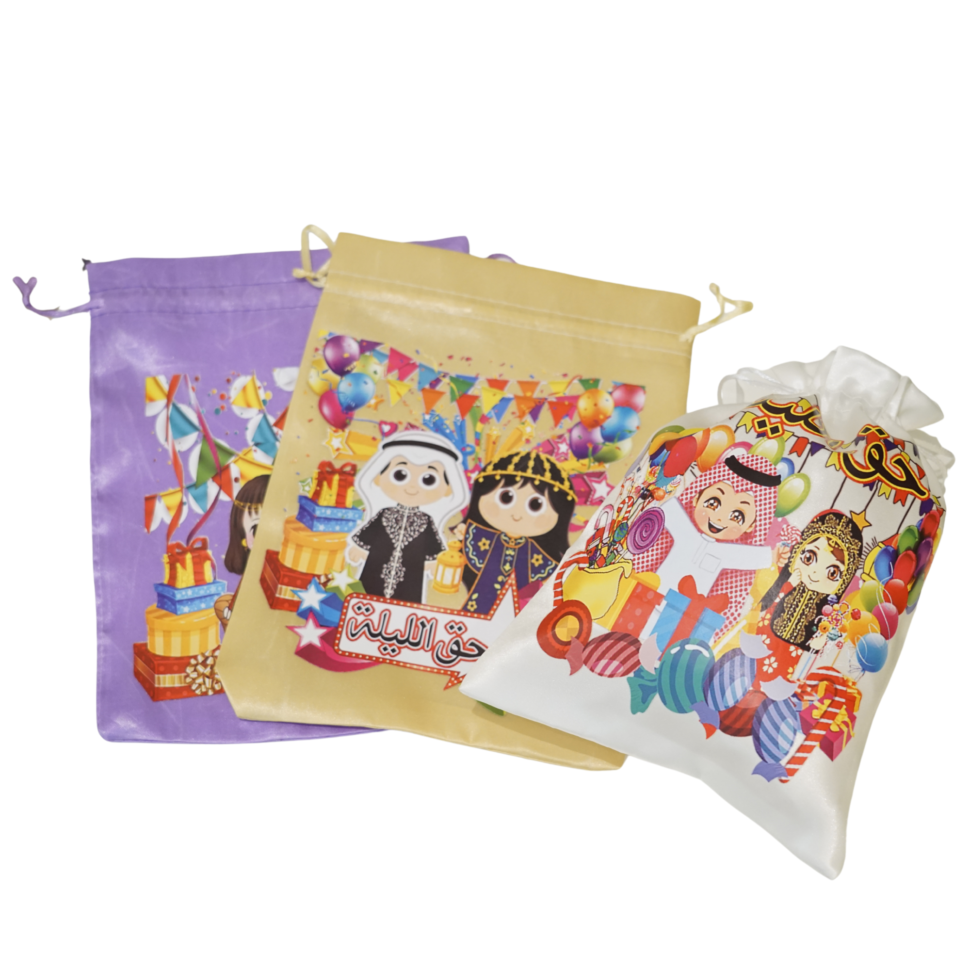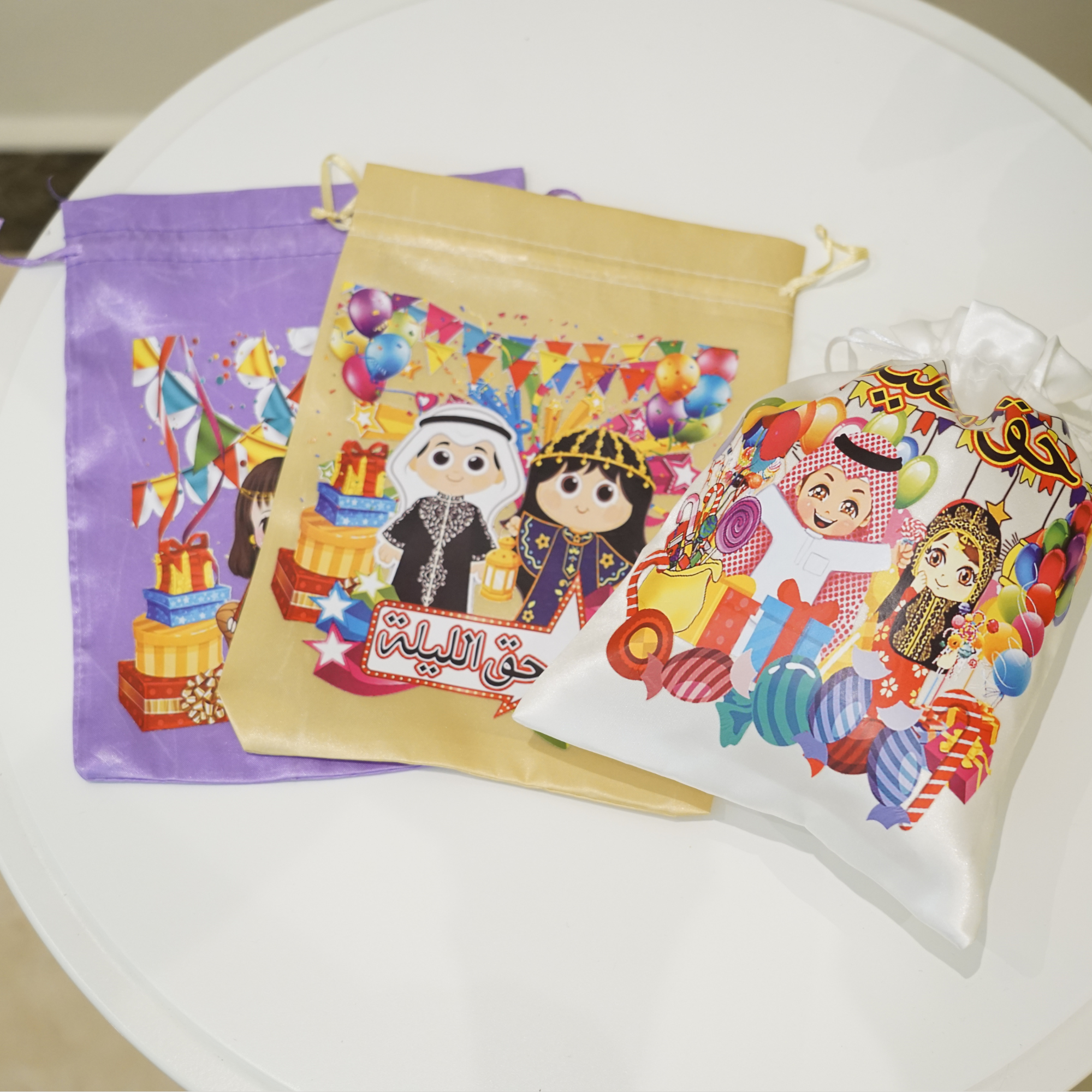 Make your celebrations extra special with these vibrant Haq Al Laila–themed drawstring gift bags. Designed with cute cartoon characters, balloons, sweets, and festive elements, these bags are perfect for distributing Haq Al Laila treats, chocolates, candies, small gifts, and party favors. Made from lightweight yet durable fabric, they are reusable and easy to carry, adding charm and joy to Haq Al Laila, birthdays, and special occasions.