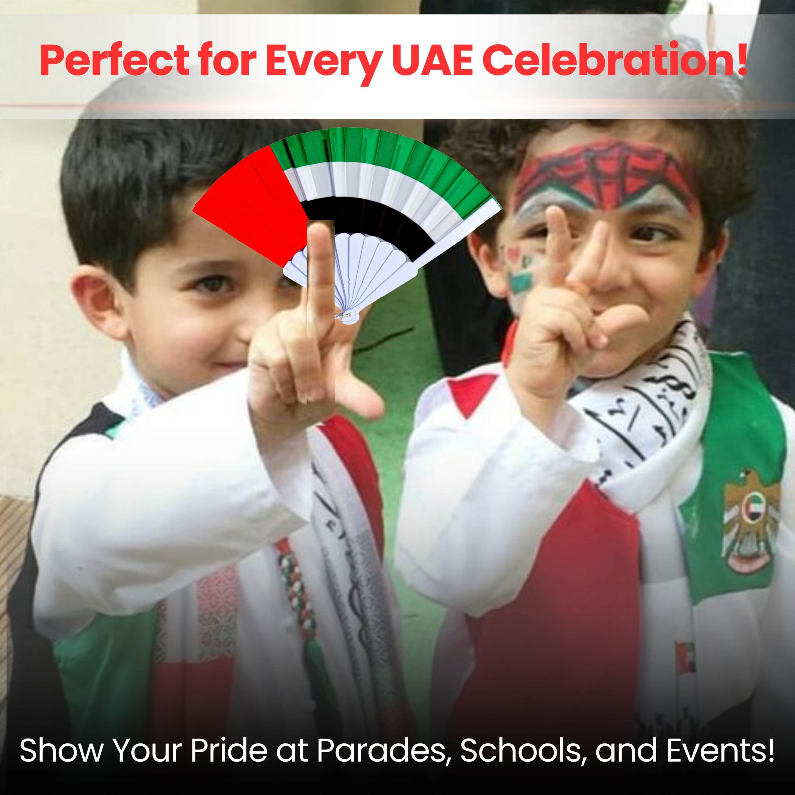 Each fan is beautifully designed in the UAE flag colors — red, green, white, and black, symbolizing unity and patriotism.
