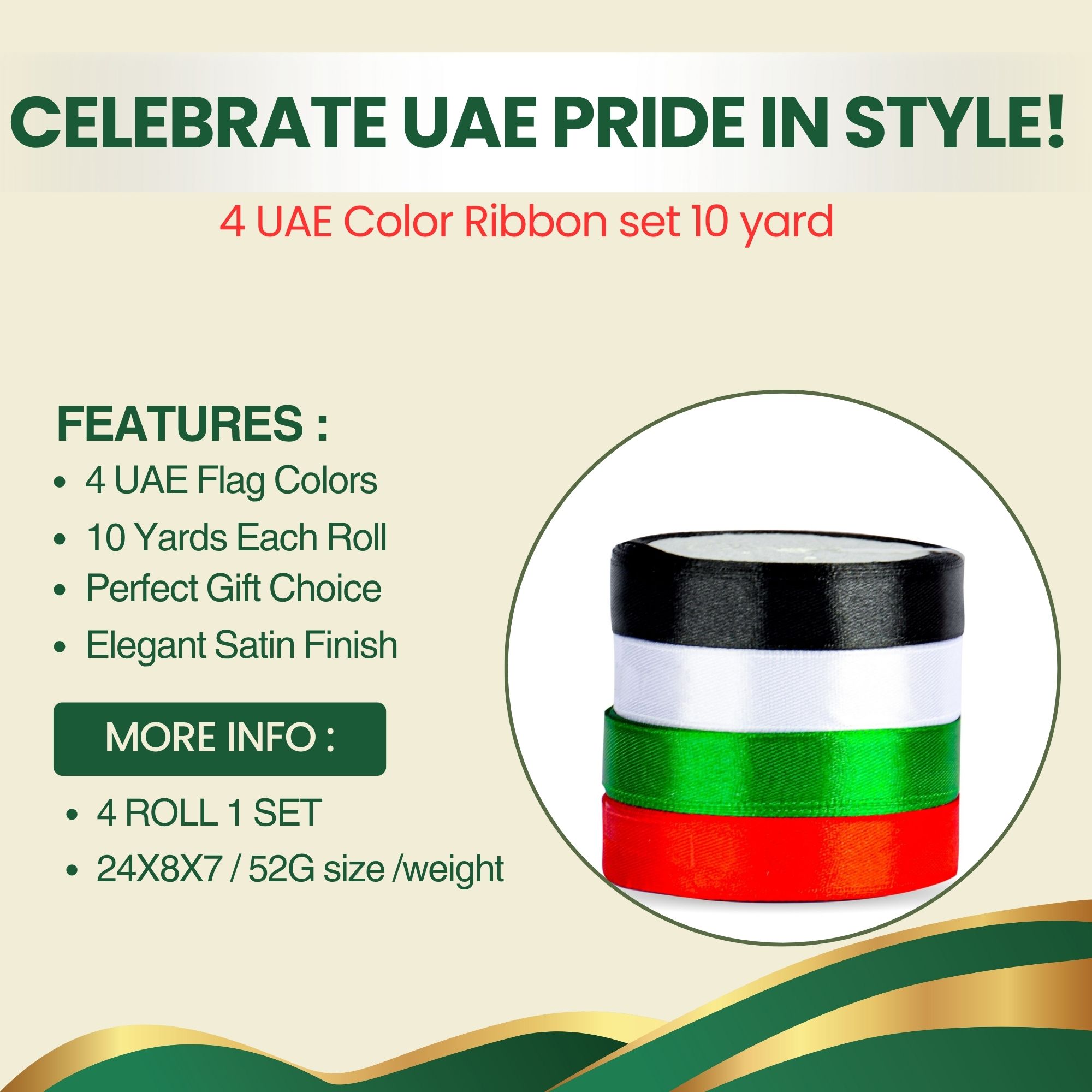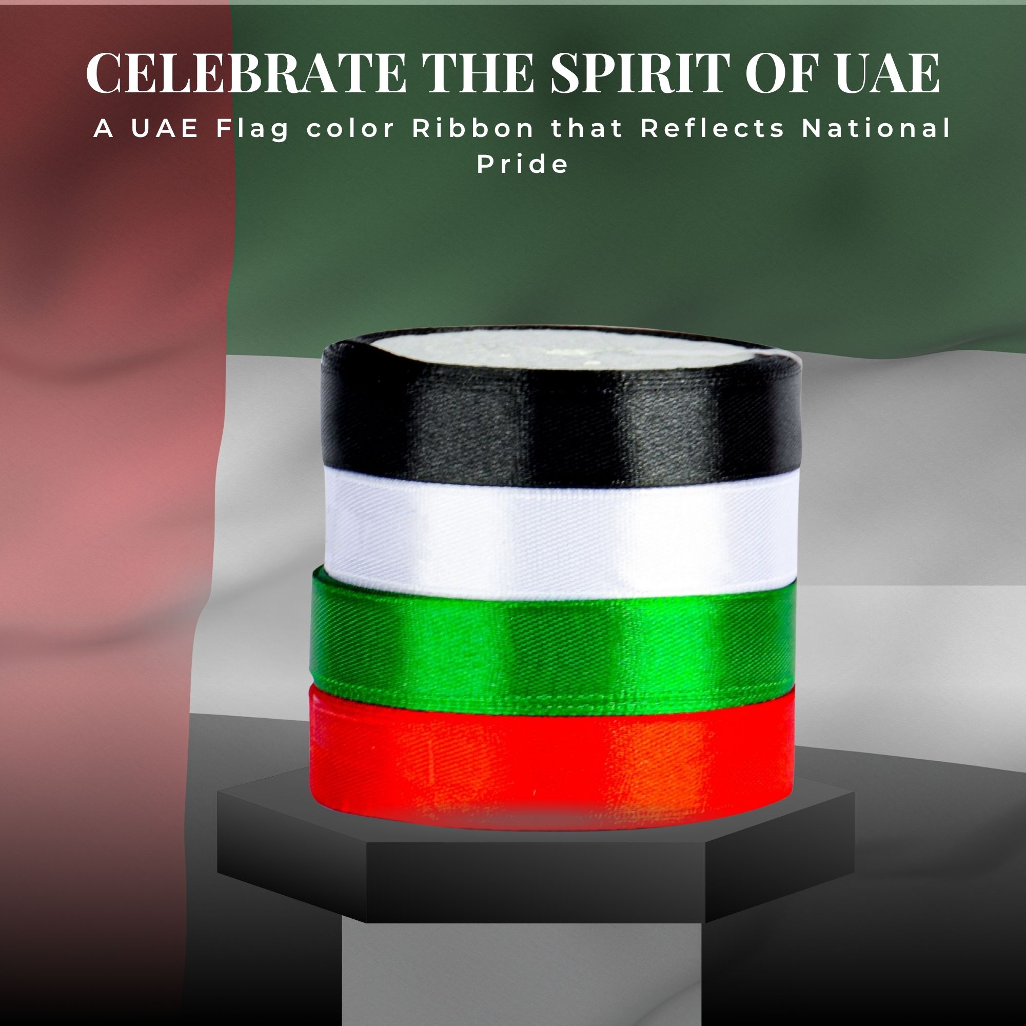Celebrate the pride of the UAE with this 4-piece UAE Color Ribbon Set, featuring 10-yard rolls in the national flag colors — red, green, white, and black.
